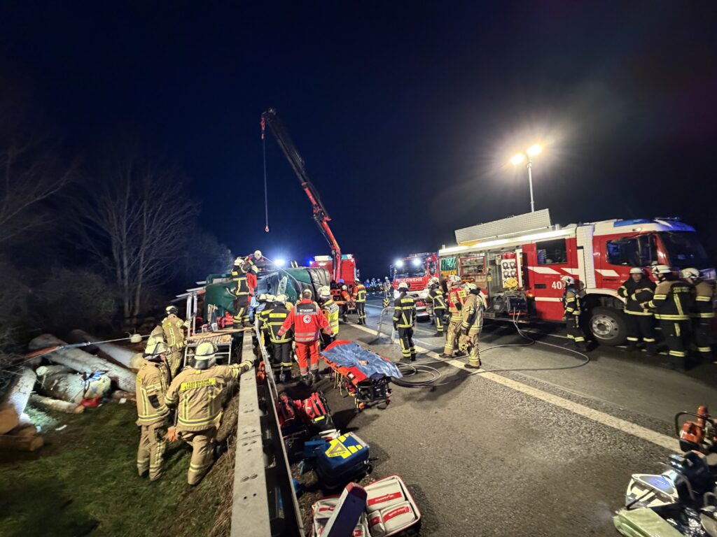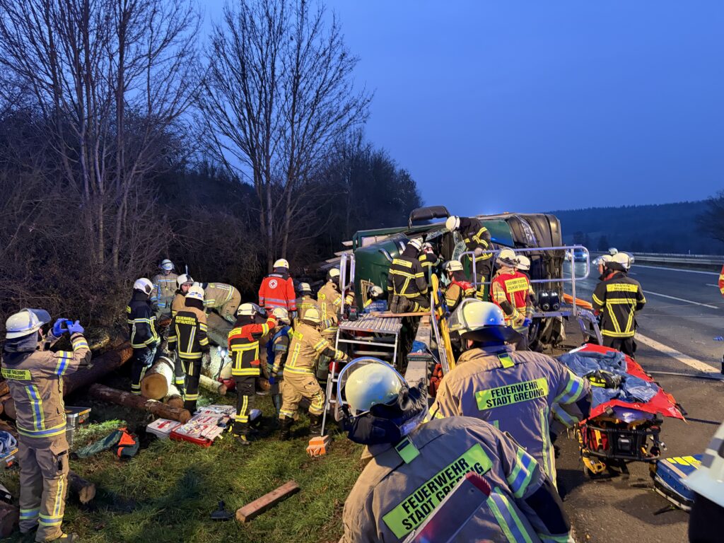 Verkehrsunfall auf der BAB 9 in Fahrtrichtung München mit einem auf der Seite liegendem LKW und einer eingeklemmten Person.